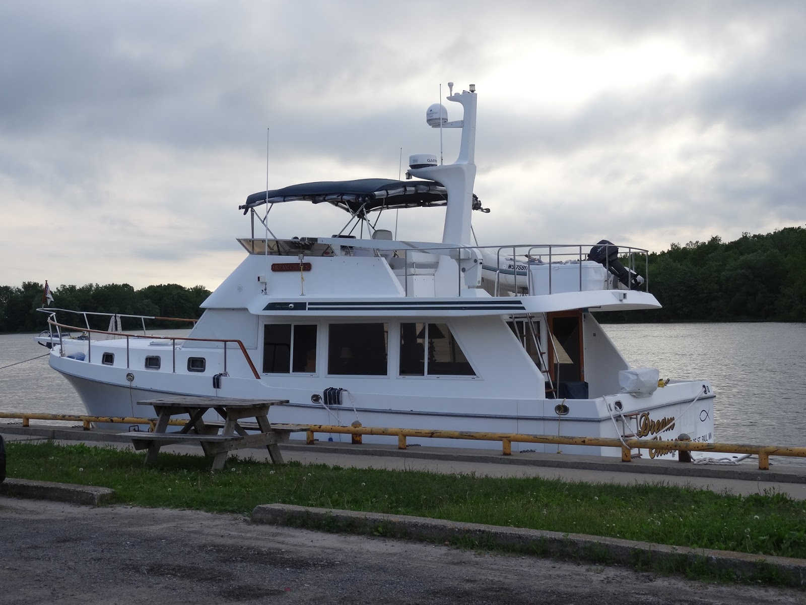 At 5:30 am Dream Chaser’s diesel engines were started, and after a bit of warm up, she pulled from her dockage at Hawkesbury and headed back into the current of the Ottawa River. Storms are predicted to be moving into this area by 9 am, so we plan to be a few hours north when that occurs. Now, temps are at 63, it is overcast, and a great morning for motoring.